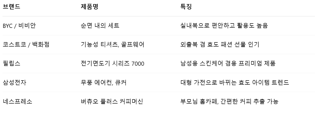 | 🏠 가전제품 | 식기세척기, 로봇청소기, 전자혈압계 | 실생활에 도움 주는 효도템으로 만족도 높음 |