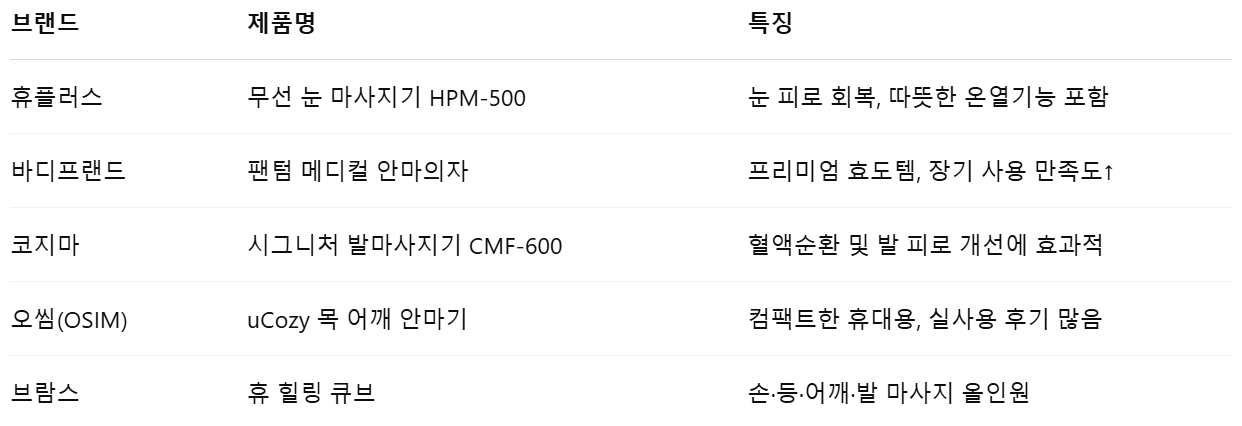 | 💆♀️ 건강 / 휴식 아이템 | 안마기, 온열찜질기, 마사지 쿠션 | 피로 회복 + 건강 관리까지 챙길 수 있어요 |