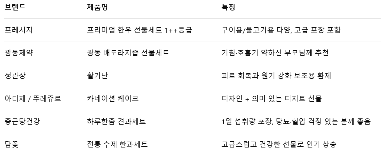 | 🧧 건강즙 / 건강 간식 | 흑마늘즙, 배도라지즙, 견과류 세트 | 몸 챙기고 싶은 부모님께 꾸준히 인기 |