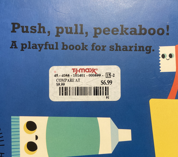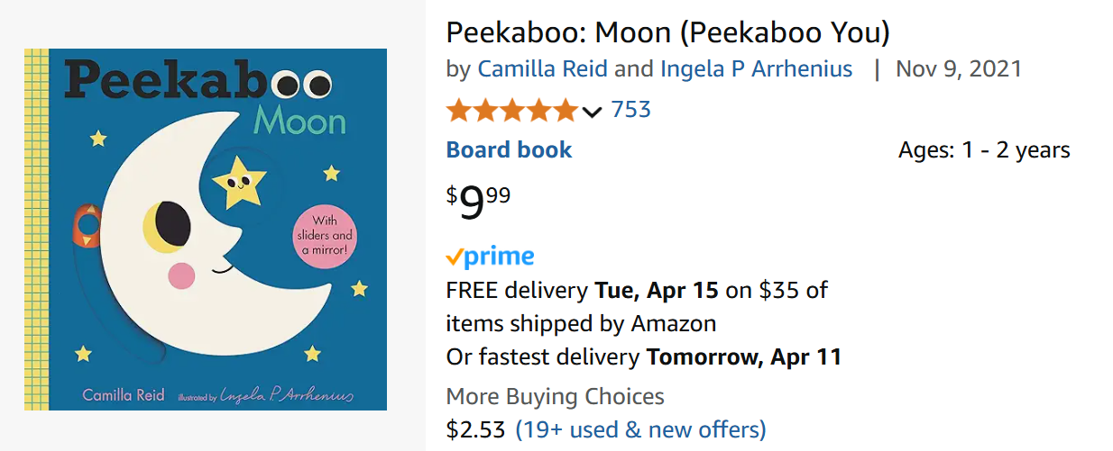 Peekaboo Moon이라고 평이 아주 좋은 책이에요. 그냥 책이 아니라 슬라이드 장치들이 있어서 재미있는 책이죠. 이것도 여기선 6.99불에 샀어요. 이 책이 잘 없긴한데 열심히 찾으니까 있더라구요!