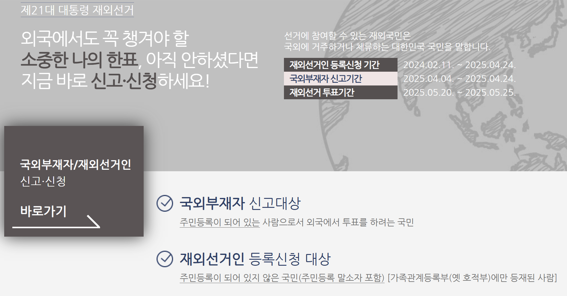 - 국외부재자: 주민등록이 되어 있고 해외 체류 중인 국민